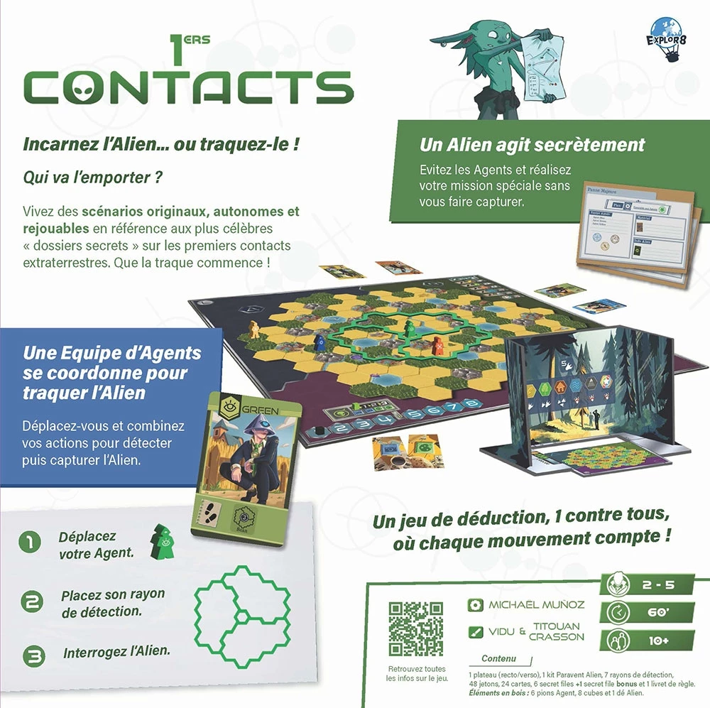 Dans 1ers Contacts, vivez une expérience unique de jeu “1 contre tous”. Un joueur incarne un Alien qui se déplace secrètement pour accomplir sa mission, tandis que les autres joueurs forment une équipe d’agents déterminés à le traquer et le capturer.