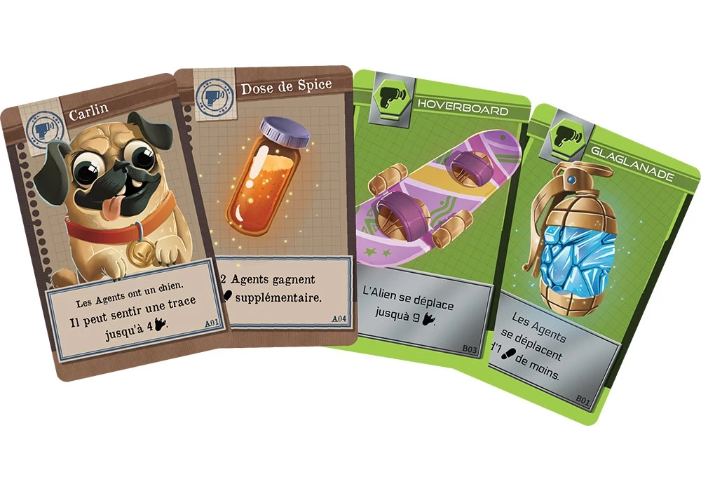 Utilisez des cartes Équipement pour prendre l’avantage : accélérez avec un Hoverboard, ralentissez vos adversaires avec une Glaglanade ou pistez l’Alien grâce au Carlin renifleur. Chaque partie propose de nouvelles approches tactiques.