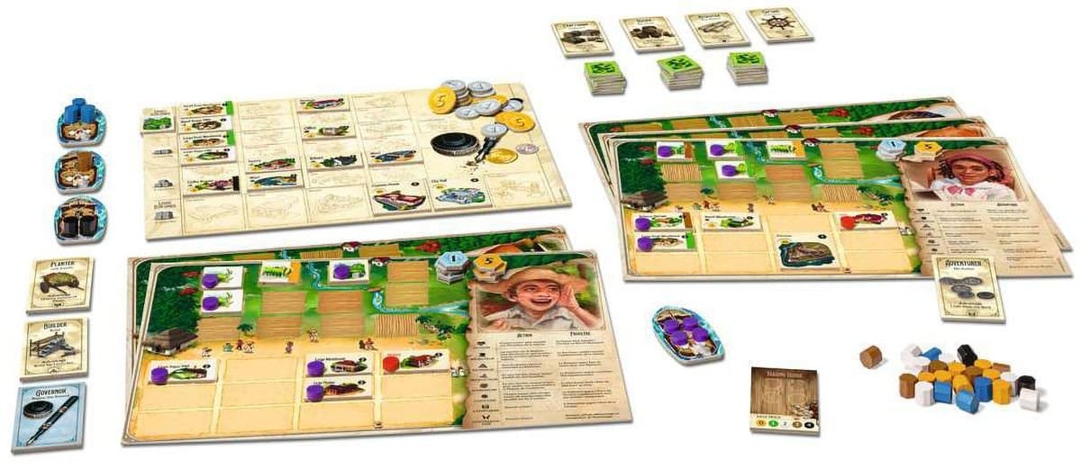 Chaque joueur dispose de son propre plateau de jeu, comprenant des espaces pour les bâtiments de la ville, les plantations et les ressources. Les joueurs partagent trois navires, une maison de commerce et une réserve de ressources et de doublons.