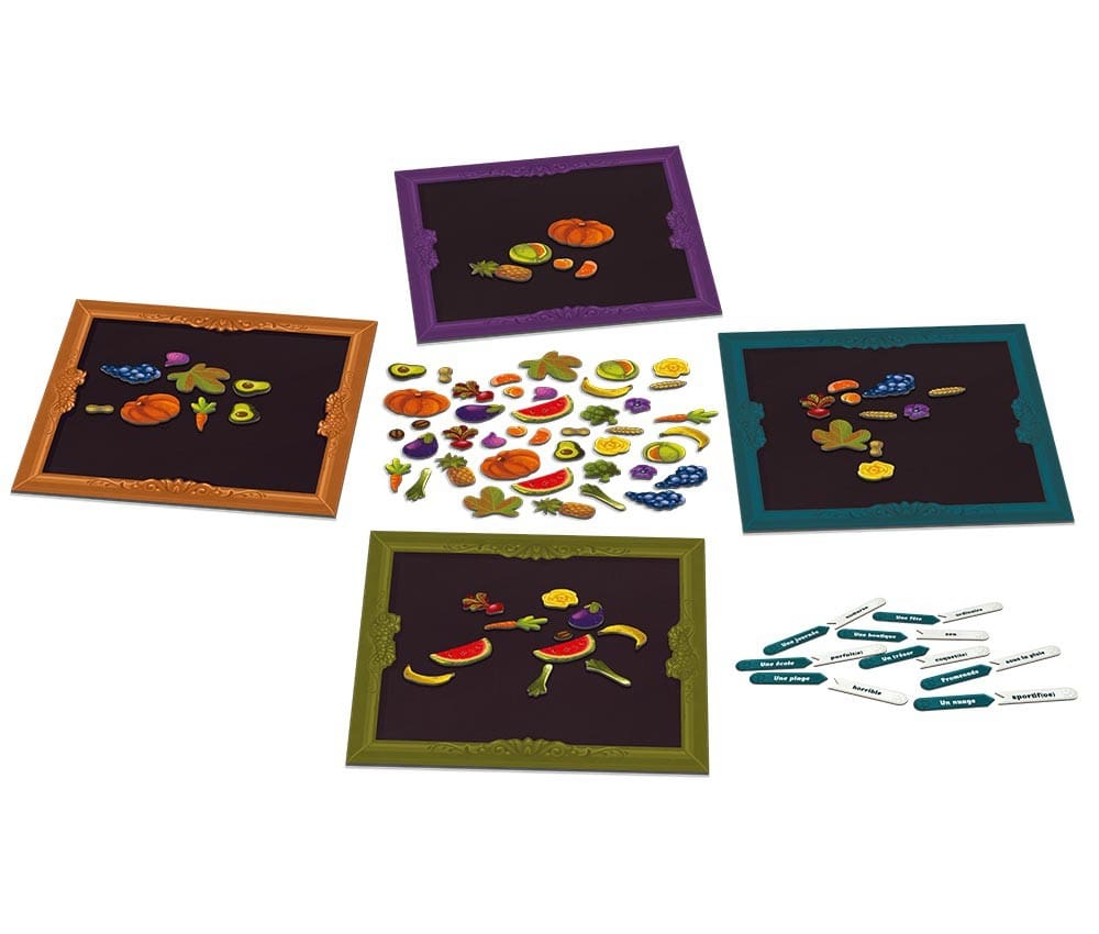Arcimboldo et ses élèves doivent chacun créer une « œuvre » à l’aide des éléments de composition magnétiques, fruits, légumes, fleurs et céréales. Ils devront réaliser la meilleure interprétation d’un titre, composé d’un mot et d’un complément, sans contrainte de temps, puis voter pour leur préférée À la manière d’Arcimboldo, s’inspire des tableaux de Giuseppe Arcimboldo. Les joueurs vont utiliser des fruits, légumes, céréales et fleurs magnétiques pour créer des œuvres. Ici, pas de stress d’exécution, place à la création ! La partie se déroule en tours. Au début d’un tour, le Maître Arcimboldo prend une demi-étiquette nom, puis une demi-étiquette complément. Il les associe à sa guise, les deux demi-étiquettes étant recto-verso. Une fois la combinaison choisie, le Maître annonce le titre et le place à la vue de tous. Les joueurs vont créer des œuvres à l’aide des éléments magnétiques, fruits, légumes, céréales et fleurs. Dès qu’un joueur a terminé son œuvre, il pivote son plateau cadre afin que les autres joueurs puissent la visualiser dans le bon sens. Il est temps pour chacun de commenter son œuvre en quelques mots en commençant par le Maître Arcimboldo, puis chaque joueur dans le sens des aiguilles d’une montre. Une fois que chacun a commenté son œuvre, les joueurs votent pour celle qui leur paraît la plus convaincante. Pas de stress d’exécution, place à la création !