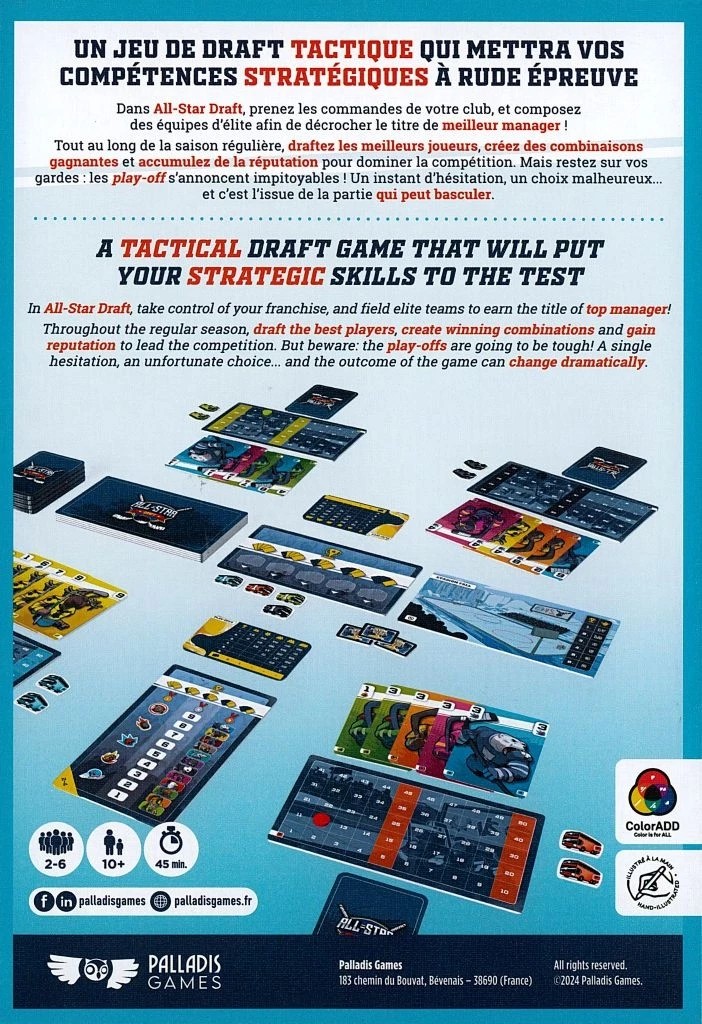 Devenez le manager ultime dans All-Star Draft, un jeu de cartes pour 2 à 6 joueurs où vous recrutez les meilleurs joueurs de hockey pour former l’équipe la plus redoutable. Affrontez vos adversaires en saison régulière puis en séries éliminatoires pour conquérir le cœur des fans et remporter la All-Star Cup !