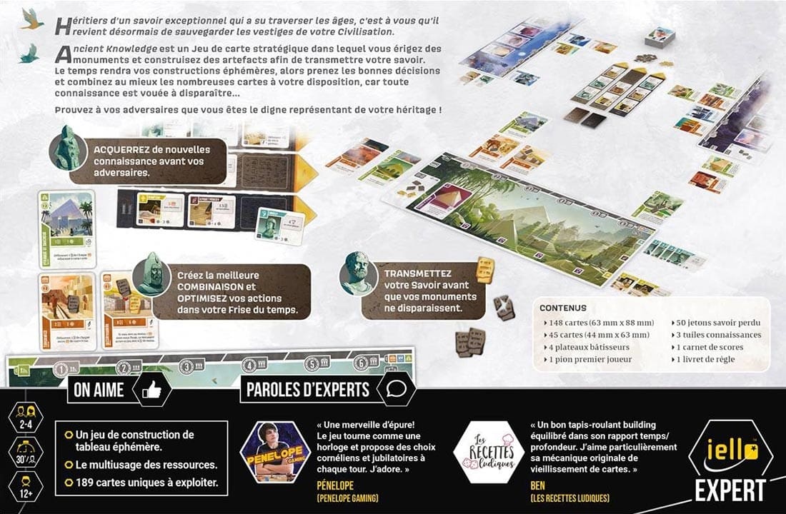 Ancient Knowledge propose une mécanique de jeu originale d’engine building, où les joueurs bâtissent des monuments et sauvent le savoir de l’oubli. La combinaison habile des cartes monuments et artefacts, ainsi que la gestion astucieuse du déclin, sont essentielles pour remporter la victoire. La subtile interaction entre les joueurs ajoute une nervosité passionnante à chaque partie.