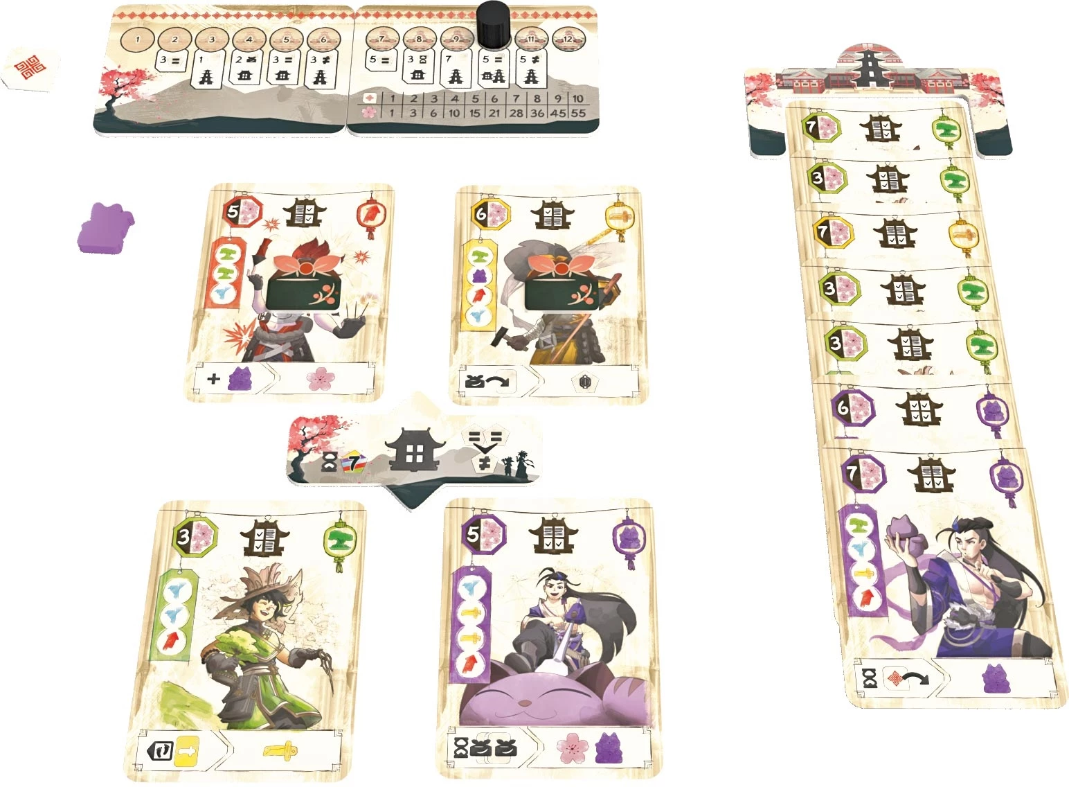 Dans le jeu Arigatō, chaque joueur représente un village rival cherchant à briller à l’occasion de l’anniversaire du Shogun.