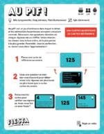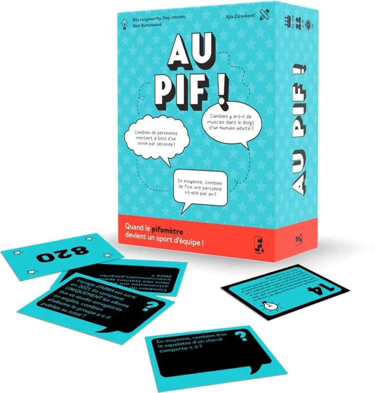 Dans le jeu Au Pif !, les joueurs font appel à leur intuition, leur logique collective et leur persuasion pour relever un défi collaboratif : classer correctement des réponses chiffrées à des questions… sans jamais les connaître à l’avance. Chaque partie débute avec une carte Référence placée au centre de la table, servant de point de repère numérique. À tour de rôle, les joueurs piochent une carte Question, lisent la question à voix haute, puis débattent ensemble afin de déterminer si la réponse est plus petite ou plus grande que les valeurs déjà posées.