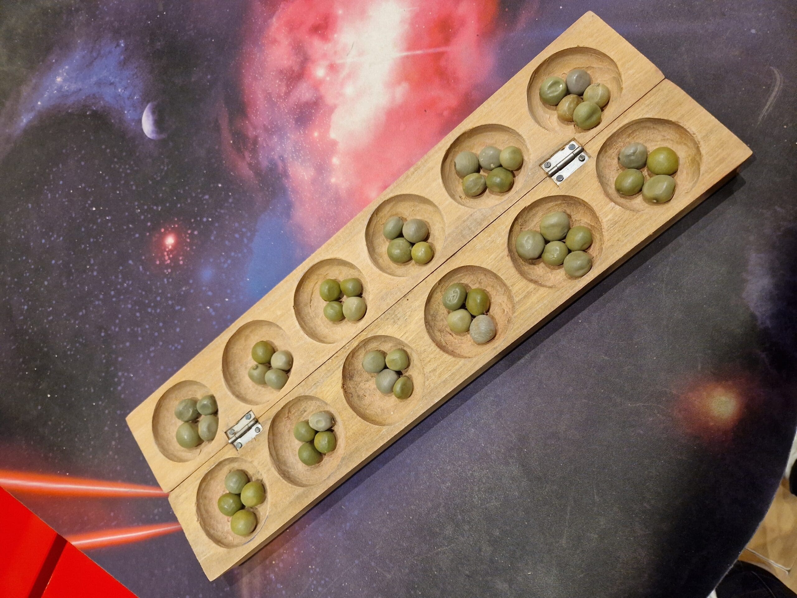 – But du jeu : S’emparer d’un maximum de graines. Le joueur qui a le plus de graines a la fin de la partie l’emporte. – Nombre de joueurs : 2 – Préparation : Le plateau est placé horizontalement entre les deux joueurs. Chaque joueur place 4 graines dans chacun des 6 trous devant lui.