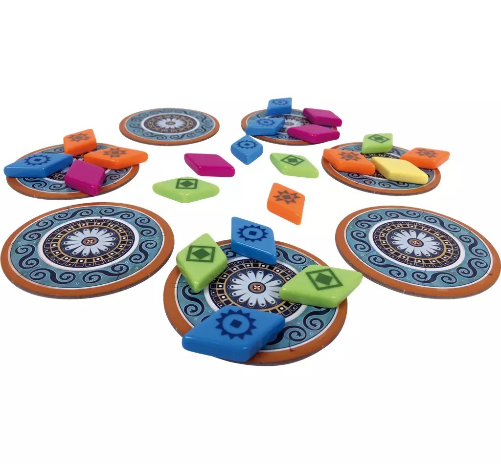 Le principe des tuiles réparties sur les Fabriques reste le même. Vous pouvez choisir de prendre toutes les tuiles d’une couleur sur une fabrique ou au centre, plus une tuile de la couleur joker. Mais ici, chaque joueur possède un tableau en forme d’étoile en 7 parties représentant les couleurs en jeu, chacune composée de six tuiles. Chaque emplacement comporte un chiffre de 1 à 6. Pour placer une tuile sur un emplacement, il faut défausser un nombre de tuile de cette couleur (en s’aidant de joker) égal au chiffre qui y est inscrit. Vous marquez 1 point pour cette tuile et 1 point pour chaque tuile de cette étoile connectée à celle nouvellement placée. Après six tours, un bonus est octroyé pour chacune des sept étoiles remplies complètement, un autre pour avoir couvert tous les espaces de valeur 1, 2, 3 ou 4.