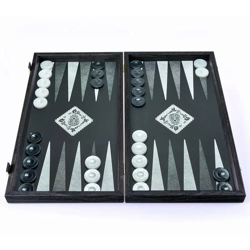 Backgamon pliant (38 x 23cm), plateau imprimé, pions acryliques marbrés.