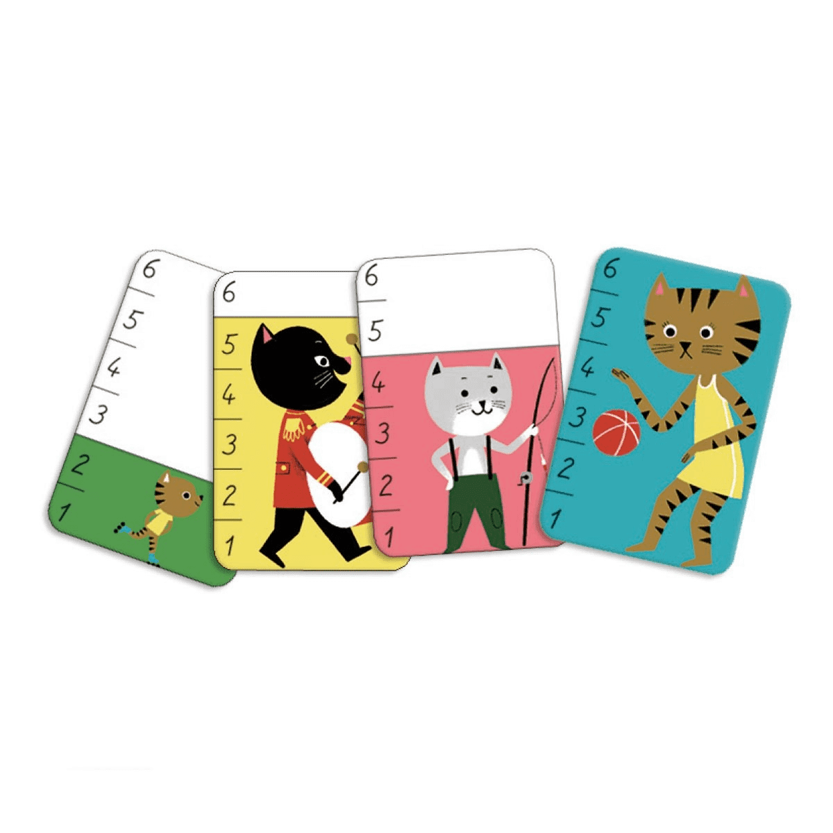 Découvrez Batamiaou de Djeco, un premier jeu de bataille pour les plus petits, qui se repère grâce à la taille des chats, un jeu de cartes pour les enfants de 3 à 6 ans. Pour les fans de Batawaf, voici Batamiaou! 1,2,3 les joueurs retournent en même temps la première carte de leur jeu : le chat le plus grand remporte le pli. Si plusieurs chats sont de même taille, il y a « Bata-Miaou » ! Quand un joueur a gagné toutes les cartes, il remporte la partie. Les cartes sont graduées de 1 à 6, donc pour les plus petits, pas besoin de savoir compter, il suffit de comparer la taille des chats! Des illustrations avec des chats rigolos qui plairont aux petits. Une boîte de jeu compacte, un jeu de voyage à emporter partout.