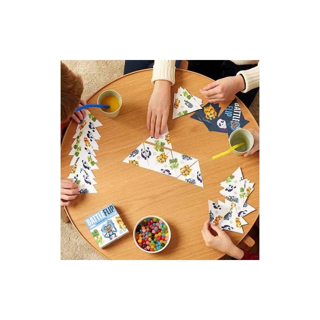 Avec ses cartes triangulaires originales, Battle Flip se distingue visuellement tout en étant compact et facile à transporter. C’est le jeu parfait pour jouer partout : en voyage, en soirée ou à la maison.