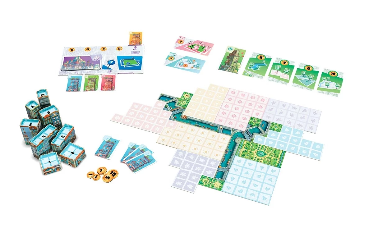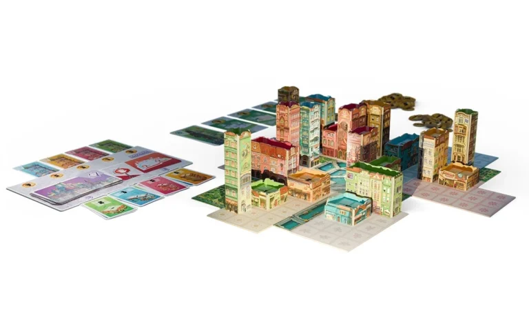 Le plateau modulable assure une grande rejouabilité : chaque configuration modifie les zones les plus attractives et renouvelle les stratégies. Les bâtiments s’empilent physiquement, donnant une lecture immédiate de la verticalité et du potentiel de score.