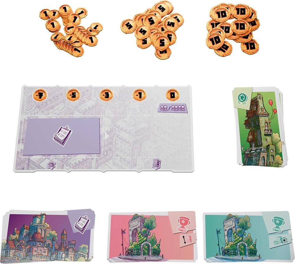 les plus avantageux, tout en respectant les contraintes imposées par la mairie. La concurrence est rude : choisissez stratégiquement votre place dans l’ordre de construction et soyez prêt à payer le prix fort pour les meilleurs emplacements. Une fois vos huit bâtiments construits, la partie prend fin. Si vous êtes le plus riche, vous remportez la partie !