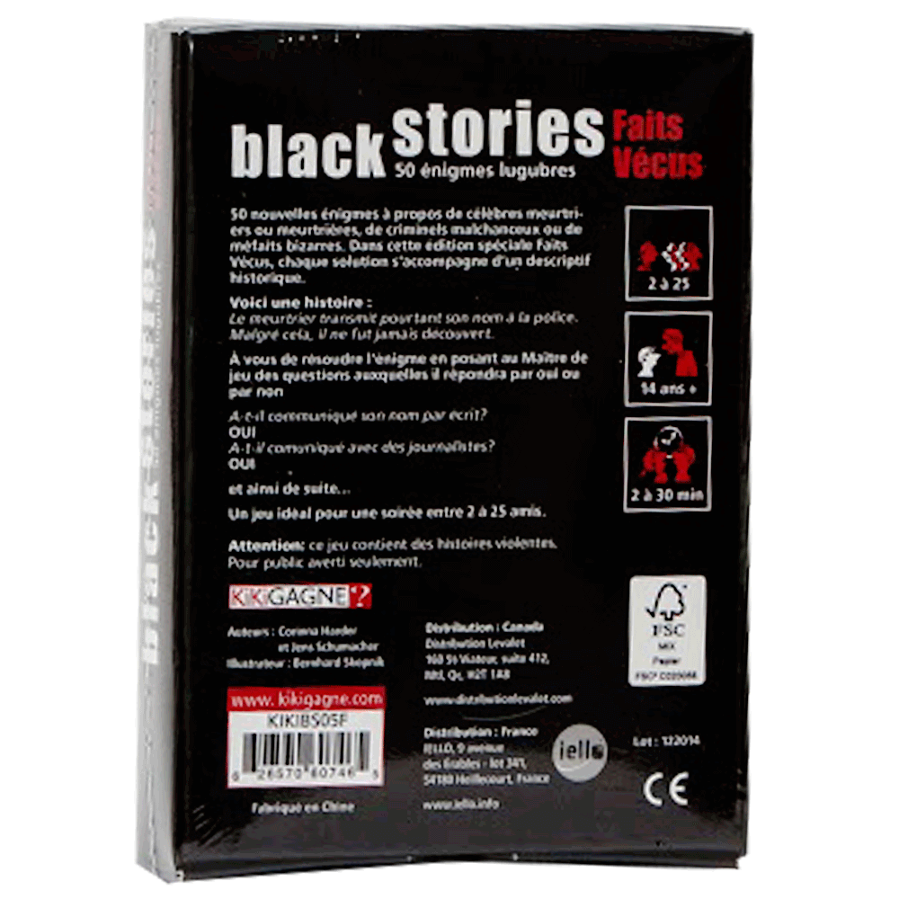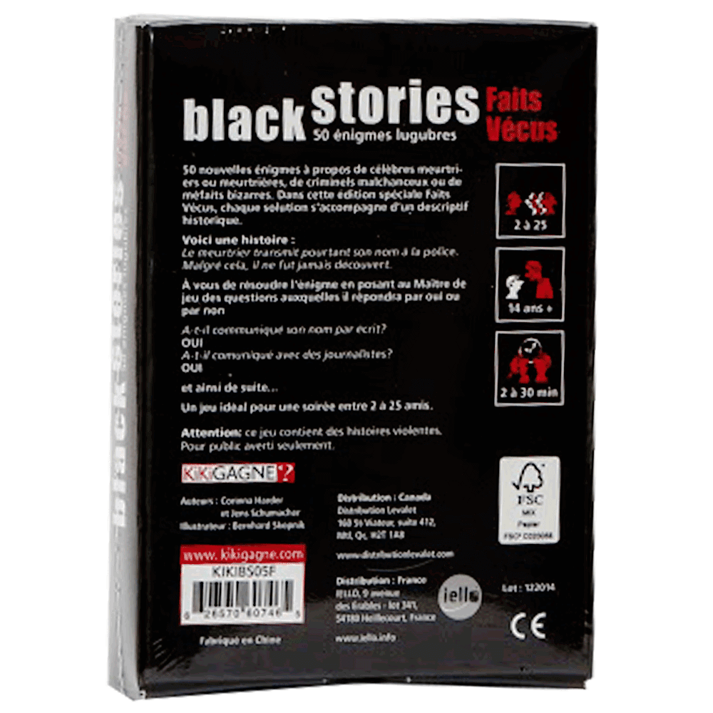 Les Black Stories sont des énigmes sinistres qui pousseront les joueurs à réfléchir différemment pour les résoudre. Reconstrituez chaque situation en posant des questions simples au maître de l’énigme, en étudiant les réponses minutieusement et en laissant votre imagination vous guider.