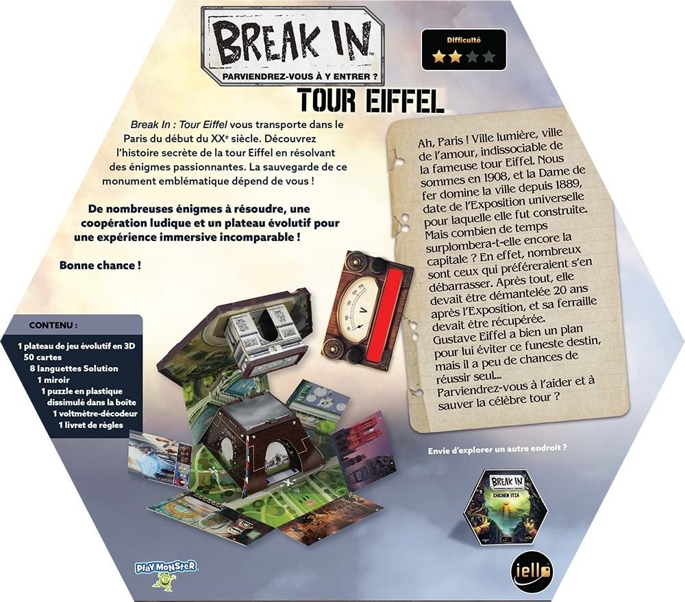 Un Voyage dans le Temps et les Mystères Paris, 1908 « Break In: Tour Eiffel » vous transporte dans l’atmosphère envoûtante de Paris au début du XXe siècle. La tour Eiffel, symbole de l’exposition universelle de 1889, est menacée. Alors que les plans de démantèlement circulent, Gustave Eiffel a un plan audacieux pour sauver son monument emblématique.