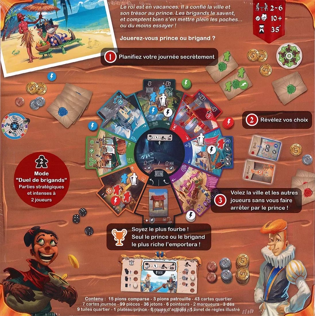 Brigands Un jeu de stratégie, bluff et tension où le prince protège son trésor Le roi est en vacances. Il a confié la ville et son trésor au prince. Mais les brigands ne comptent pas rester les bras croisés : ils veulent s’en mettre plein les poches… ou du moins essayer !