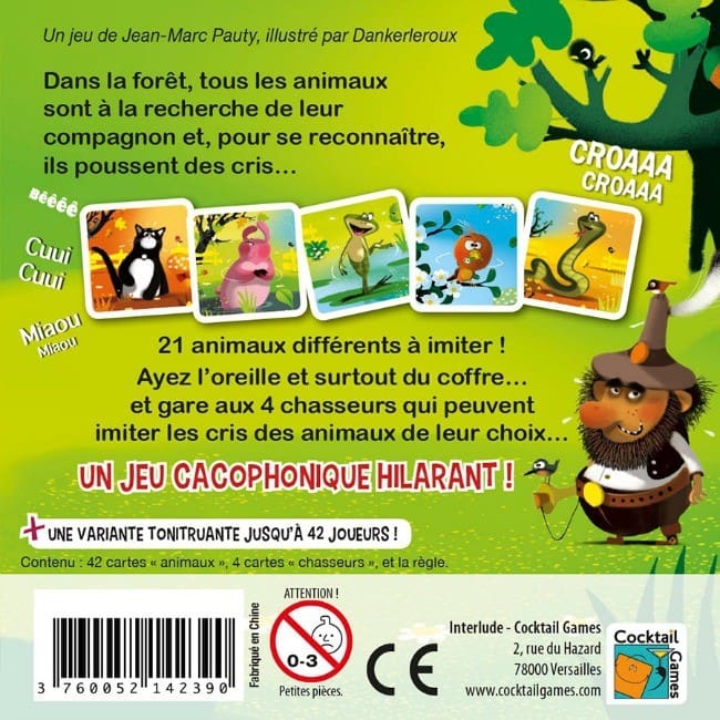 - Attention aux Chasseurs : Les cartes Chasseurs permettent d’imiter le cri d’un animal de son choix, ajoutant une touche de stratégie et de suspense au jeu.