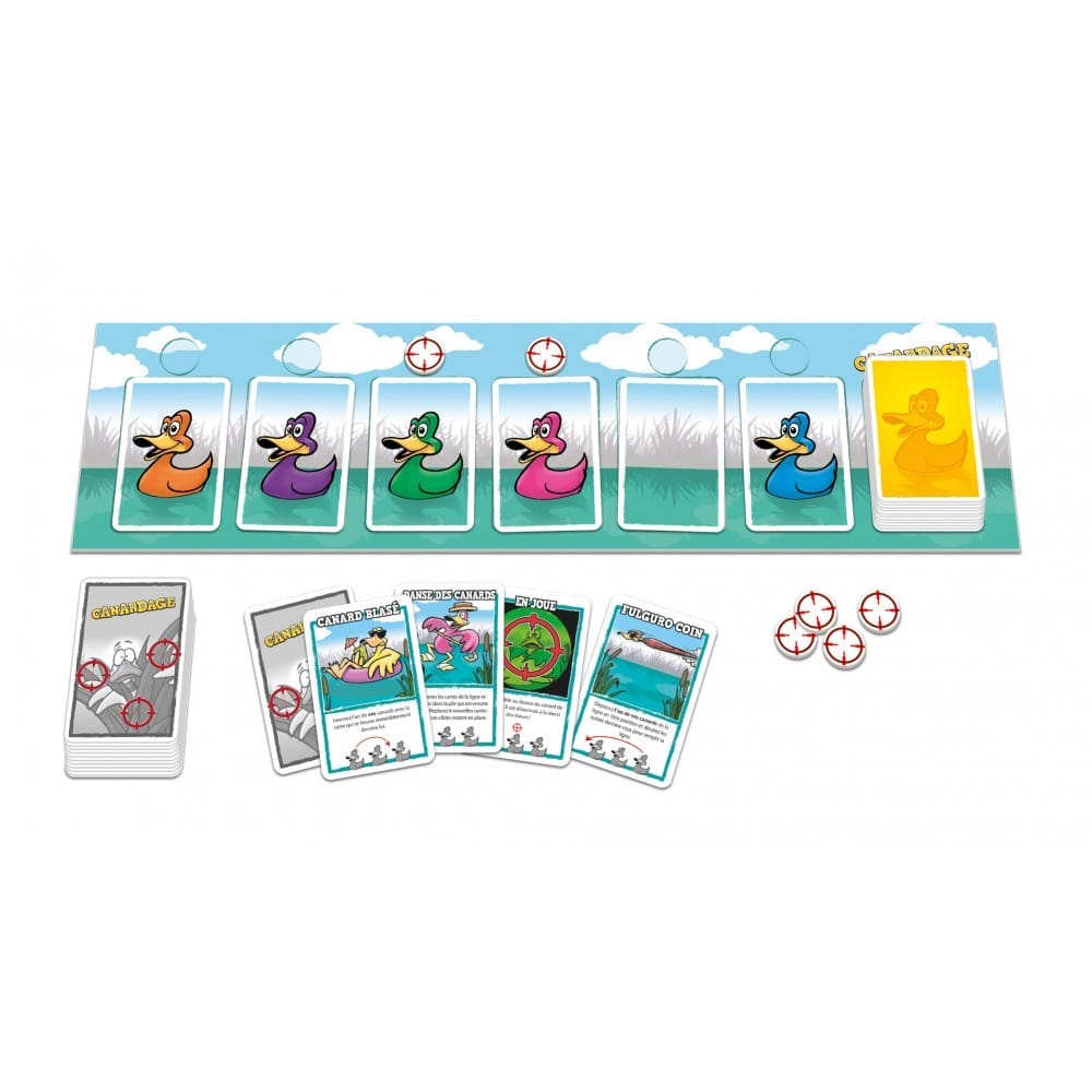 D’innocents canards barbotent en file indienne, mais personne n’est en sécurité dans ces eaux mitraillées… À chaque tour, vous devez simplement jouer l’une de vos 3 cartes. Les joueurs vont ainsi pouvoir viser, tirer, affecter la disposition des canards en se cachant derrière son voisin, etc. Mettez vos protégés à l’abris et canardez les volatiles adversaires car le dernier survivant sera le gagnant ! Le petit plus savoureux ? Même si vous n’avez plus de canard en jeu, vous pouvez encore tirer sur vos adversaires. La vengeance est un plat qui se mange froid ! Simple et délirant, Canardage est le plus savoureux des conflits de canard !