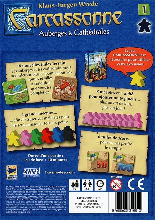 Une cathédrale triple la valeur d’une ville et une auberge double celle des chemins – mais seulement s’ils sont achevés à la fin de la partie. Le grand partisan, joué de façon stratégique, permet de bonifier certaines régions. À cela s’ajoutent le matériel complet pour un sixième joueur et six Marqueurs de points pour mieux visualiser le positionnement des joueurs. Encore plus tactique, encore plus captivant !
