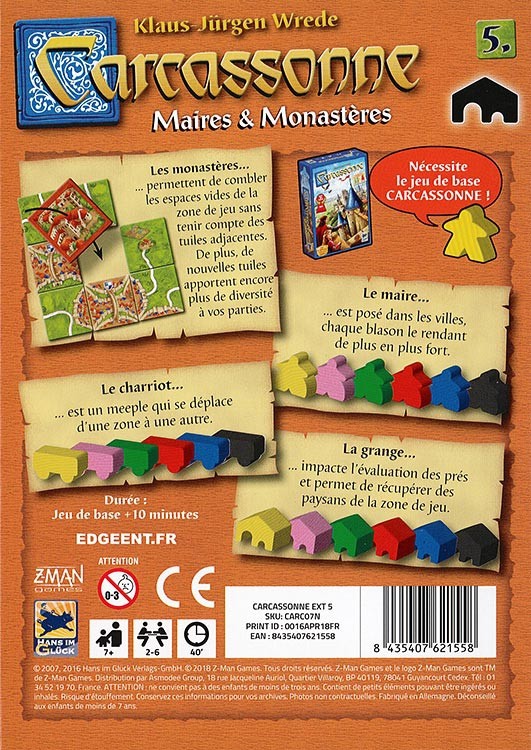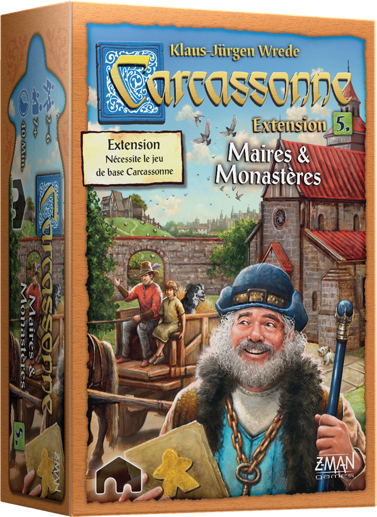 Cette extension au jeu de société Carcassonne offre aux joueurs de nombreuses possibilités pour accroître leur influence. Les Monastères : permettent de combler les espaces vides de la zone de jeu sans tenir compte des tuiles adjacentes. De plus, de nouvelles tuiles apportent encore plus de diversités à vos parties. Le Maire : est posé dans les villes, chaque blason le rendant de plus en plus fort. Le Chariot : est un meeple qui se déplace d’une zone à une autre. La Grande : impacte l’évaluation des près et permet de récupérer les paysans de la zone de jeu. Avec cette extension Maire et Monastères (Anciennement Maire et Cloîtres), les joueurs ont donc de nouvelles opportunités de consolider leur influence autour de Carcassonne.