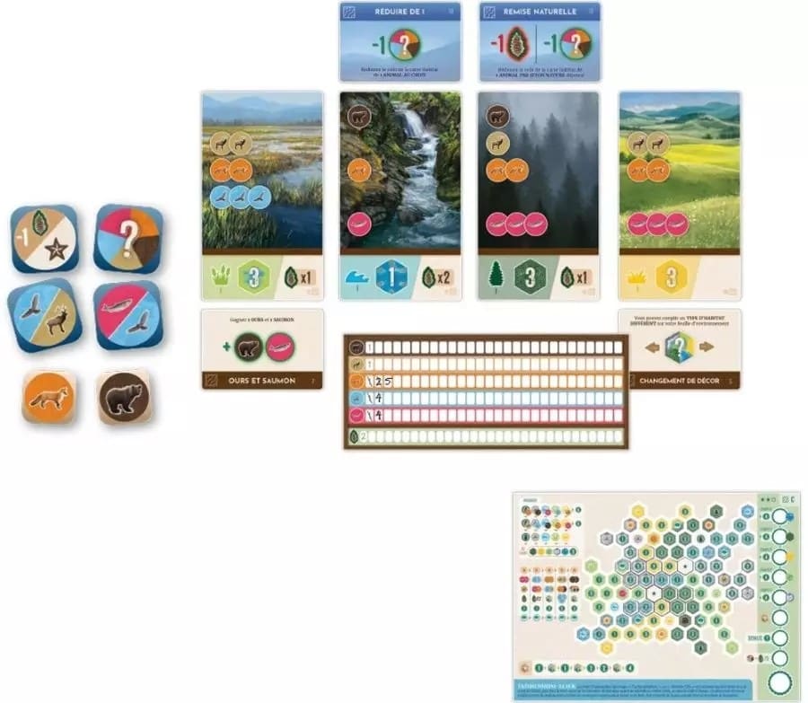 Un mélange inédit de flip & write et de roll & write Flip & write : Les cartes Habitat se dévoilent à mesure que les rounds progressent. Roll & write : Vous lancez vos dés (ainsi que les dés centraux) pour décider de vos récoltes, vos spécialisations en faune, et vos ajustements stratégiques. Objectif : Créer l’écosystème le plus harmonieux Plus vos aménagements et récoltes sont cohérents, plus vous marquerez de points. La clé est de composer judicieusement vos cartes Habitat et vos ressources naturelles pour former un ensemble équilibré :