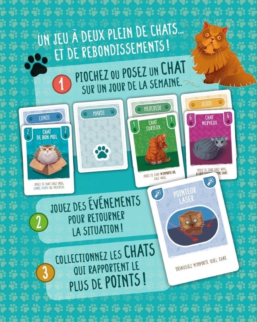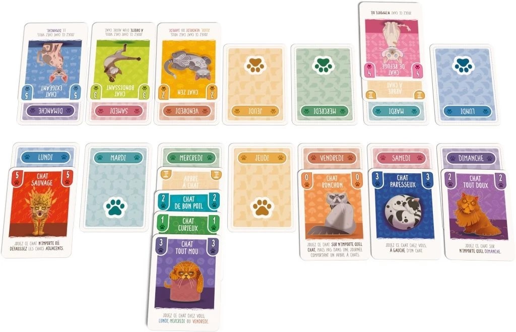 Dans Cat Days, chaque joueur dispose de sept cartes représentant les jours de la semaine (du lundi au dimanche) et tente d’y placer des chats aux capacités spéciales :