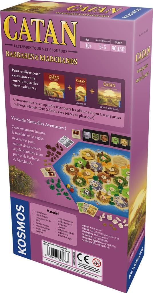 Voici l’extension pour Barbares & Marchands qui va vous permettre d’y jouer jusqu’à 6 ! Tout le matériel nécessaires et les règles s’y trouvent. L’extension est par ailleurs compatible avec toutes les éditions du jeu Catan parues en français depuis 2010. Un exemplaire de Catan et de Catan – Barbares et Marchants est nécessaire pour utiliser cette extension.