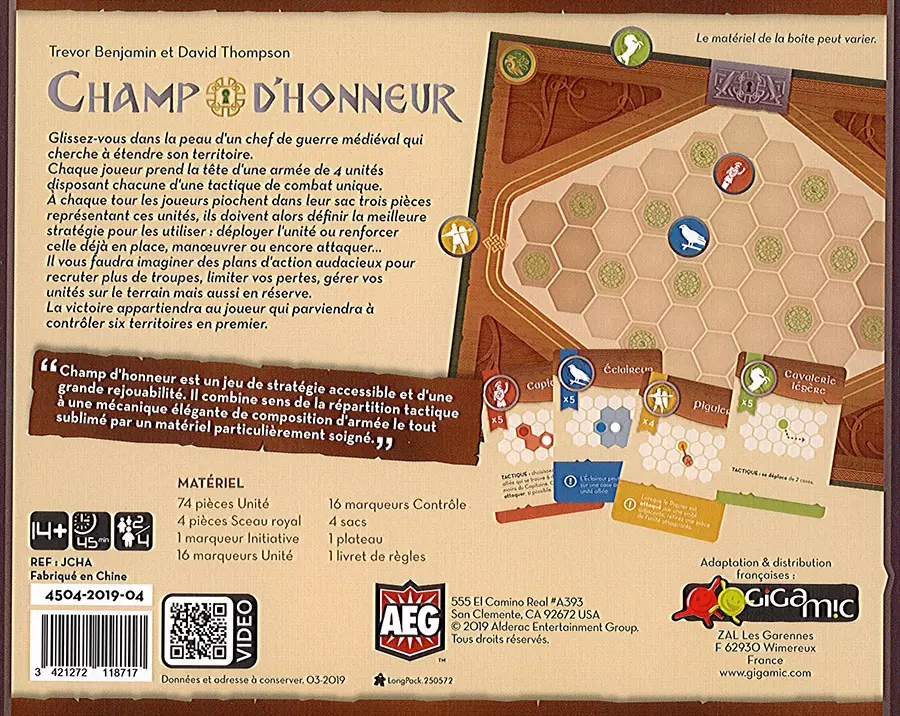 Dans le jeu Champ d’Honneur, chaque joueur prend la tête d’une armée de 4 unités disposant chacune d’une tactique de combat spécifique. À chaque tour, les joueurs piochent dans leur sac 3 pièces représentant ces unités et doivent définir la meilleure stratégie pour les utiliser : déployer l’unité ou renforcer celle déjà en place, manœuvrer ou attaquer… La victoire appartiendra au joueur qui parviendra à contrôler, en premier, six territoires.