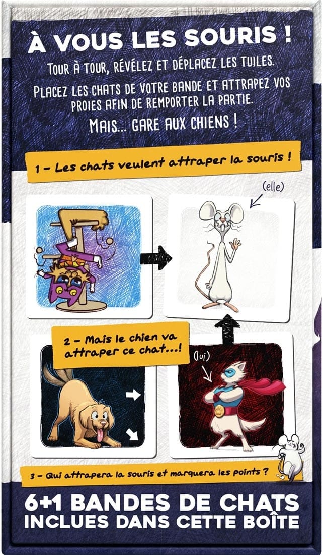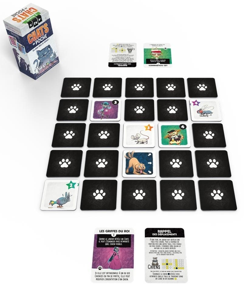 Chats de Poche est un jeu de société stratégique et amusant pour 2 joueurs. À la tête d’un clan de chats, vous devez chasser des proies tout en évitant les chiens du quartier. Révélez et déplacez des tuiles, placez vos chats judicieusement et optimisez votre stratégie pour gagner.