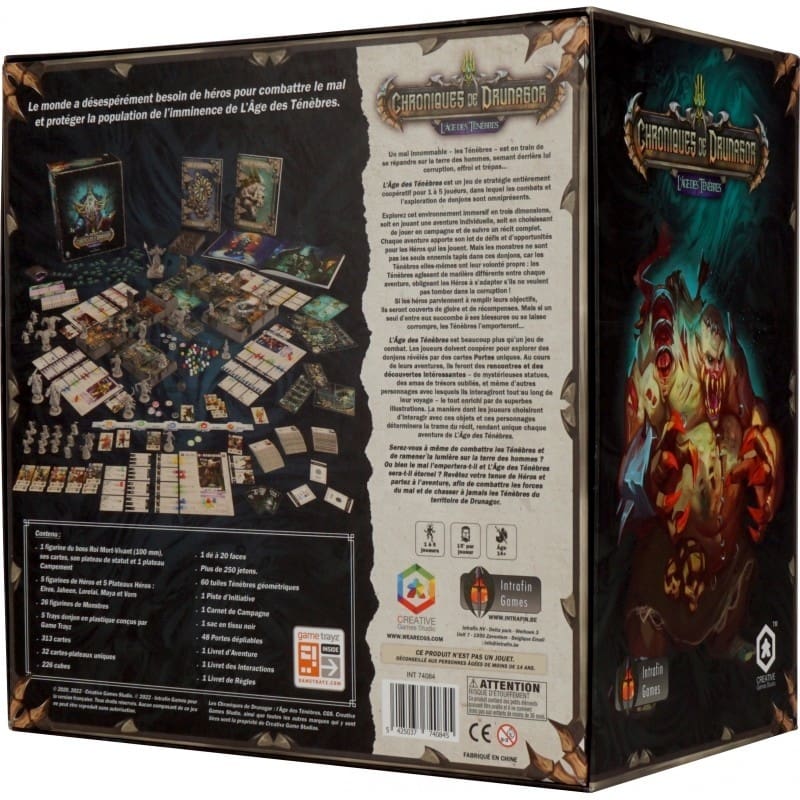 Dans « Chroniques de Drunagor – L’Âge des Ténèbres », vous entrez dans un monde de fantasy riche en aventures et en dangers. Cette boîte de jeu regorge de composants variés, allant des figurines détaillées des héros, des monstres et du redoutable Roi Mort-Vivant, aux cartes, aux jetons et aux tuiles représentant les différentes zones et défis de Drunagor.