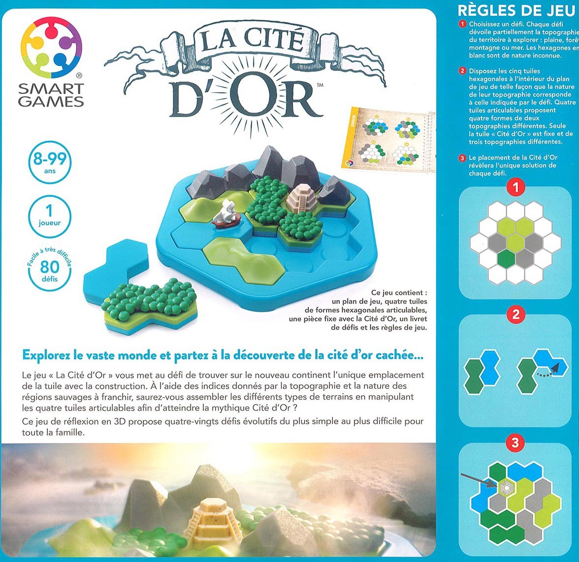 En explorant le nouveau continent trouvez l’unique emplacement de la tuile avec la pyramide. À l’aide des indices donnés par la carte sur la nature des régions sauvages à franchir, saurez-vous assembler les différents types de terrains en manipulant les quatre tuiles articulables afin d’atteindre la mythique Cité d’Or ?