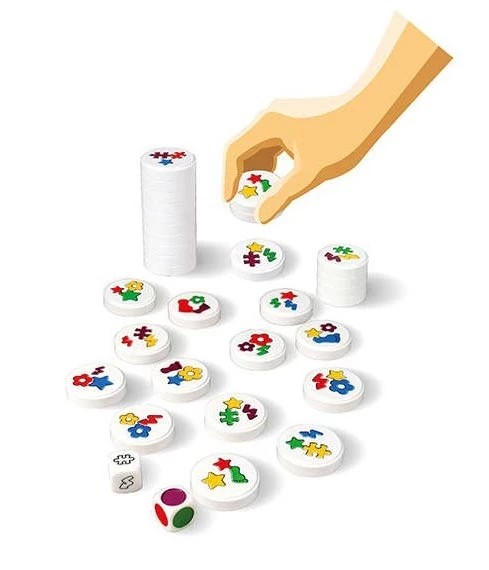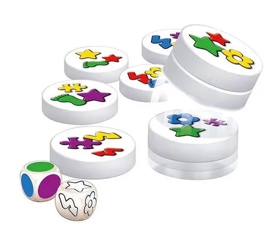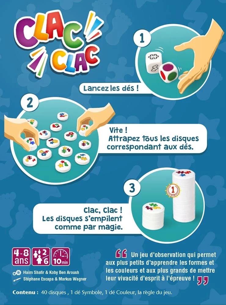 Dans le jeu Clac Clac, chaque disque comporte une combinaison unique de symboles et de couleurs. À chaque manche, deux dés désignent une couleur et une forme que les joueurs doivent retrouver. Tous en même temps, ils scrutent les disques étalés sur la table pour attraper ceux correspondant exactement à la combinaison. Mais attention, il faut faire preuve d’observation et d’une grande vivacité sans se tromper !