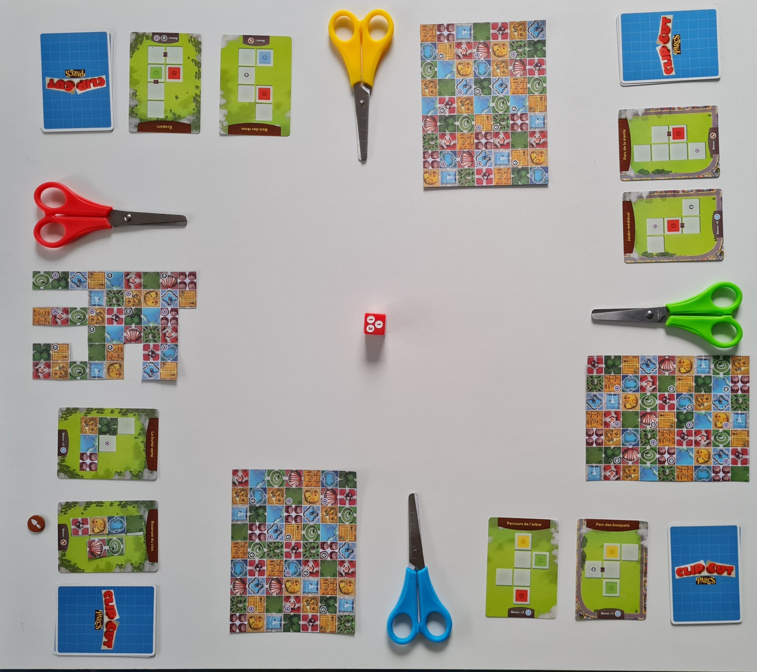 Vous connaissez les Roll & Write ? Voici un Roll & Cut. Prenez votre feuille composée de nombreuses cases différentes et de divers symboles. Prenez une carte mission et lancez les dés chacun votre tour. En fonction du résultat, vous aurez droit à un certain nombre de coup de ciseaux d’une longueur totale donnée par le dé. Allez chercher les cases qu’il vous faut mais attention, si une case non utile à votre mission est coupée de la feuille, vous prendrez des malus ! Vous aurez parfois l’occasion de poser une seule case, parfois le jeu vous demandera de trouver une suite de couleur à découper en bande.
