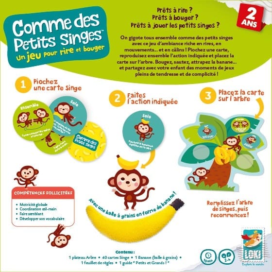 Points Forts : Accessibilité : Conçu pour les enfants à partir de 4 ans, le jeu est facile à comprendre et à jouer, avec des règles simples et des visuels attrayants. Interaction : Les joueurs interagissent les uns avec les autres, ce qui favorise la coopération et la compétition amicale. Éducatif : Le jeu aide les enfants à développer des compétences de base telles que la reconnaissance des formes, la coordination œil-main et la gestion des ressources. Illustrations : Avec des illustrations colorées et amusantes, Comme des Petits Singes attire les jeunes joueurs et les plonge dans un univers joyeux et dynamique.