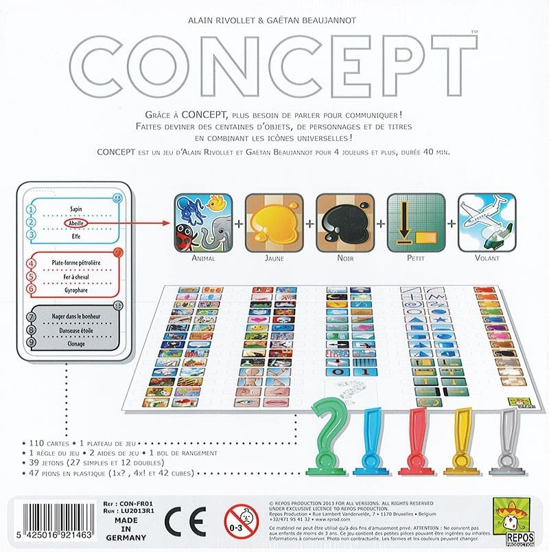 Par équipes, faites deviner des mots aux autres joueurs en plaçant des pions sur différentes icônes du plateau. Grâce aux nombreuses icônes et aux possibilités offertes par leurs interactions, il existe plusieurs façons de faire deviner chaque mot… mais ce ne sont pas les concepts les plus simples qui sont les plus faciles à faire deviner. Et qu’importe le vainqueur : tout le monde s’amusera à interpréter les concepts et à commenter la façon de faire deviner des autres joueurs !