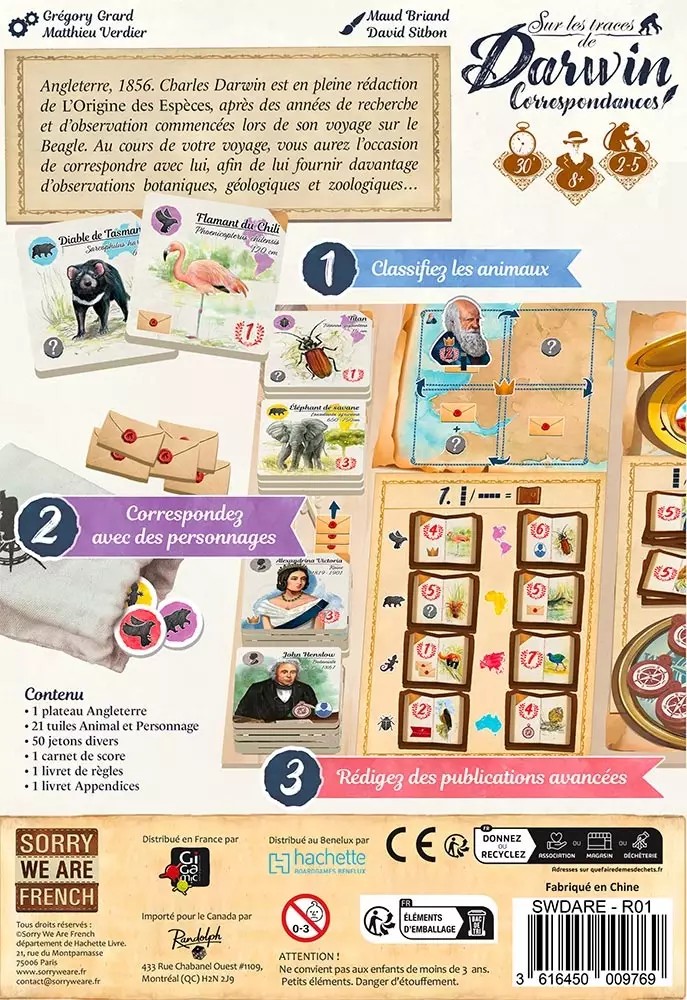 Dans cette extension « Correspondances » pour Sur les Traces de Darwin, vous incarnez ces explorateurs qui, au fil de leurs découvertes, échangent des lettres avec Darwin pour enrichir ses travaux. Botanique, zoologie, géologie… chaque observation envoyée peut faire avancer la science et vous rapporter des points décisifs !