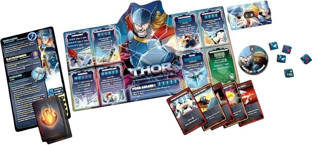 Chaque héros est équipé de son propre set de dés personnalisés, d’un plateau de jeu distinct et d’un deck de cartes unique. Ces éléments sont soigneusement conçus pour refléter les pouvoirs et les caractéristiques de chaque personnage, garantissant que chaque partie est non seulement équilibrée mais aussi profondément ancrée dans le lore de Marvel.
