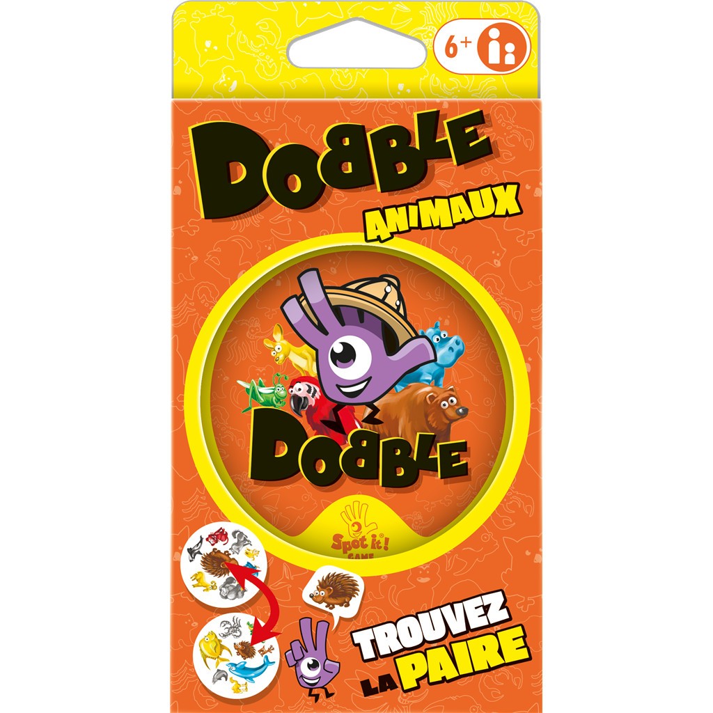 Repérez plus vite que vos adversaires l’animal en commun entre deux cartes. Dobble, le succès du jeu de réflexes et d’observation, s’allie au thème animalier, pour le plaisir des jeunes joueurs… et de tous les autres ! Le principe du Dobble, c’est qu’il y a toujours un et un seul symbole identique entre chaque carte. Trouvez-le ! Avec Dobble Animaux, les plus jeunes s’amusent à retrouver les paires d’animaux. Les règles proposent 5 variantes de jeu pour renouveler le plaisir de jouer.