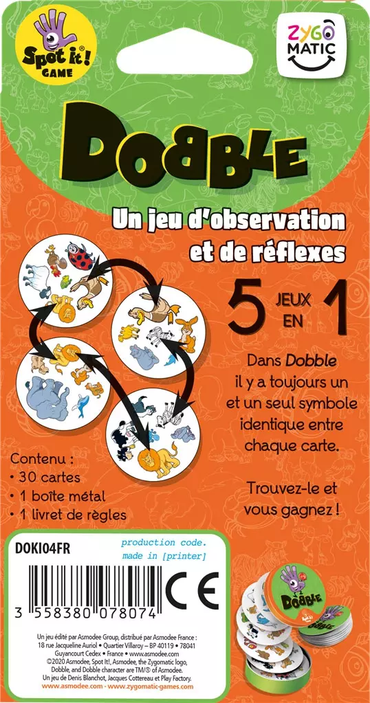 Dobble, c’est l’histoire de 10 millions de jeux vendus à travers le monde. Cette petite boîte est désormais dans la plupart des foyers français, où elle fait jouer des heures ! Un « simple » algorithme et des cartes rondes ont conquis un large public, grâce à des règles claires et assimilées en l’espace d’une minute. Une boîte de Dobble, c’est l’assurance d’une ambiance folle autour de la table !