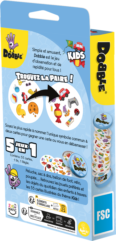 Dobble, c’est l’histoire de 10 millions de jeux vendus à travers le monde. Cette petite boîte est désormais dans la plupart des foyers français, où elle fait jouer des heures ! Un « simple » algorithme et des cartes rondes ont conquis un large public, grâce à des règles claires et assimilées en l’espace d’une minute. Une boîte de Dobble, c’est l’assurance d’une ambiance folle autour de la table !