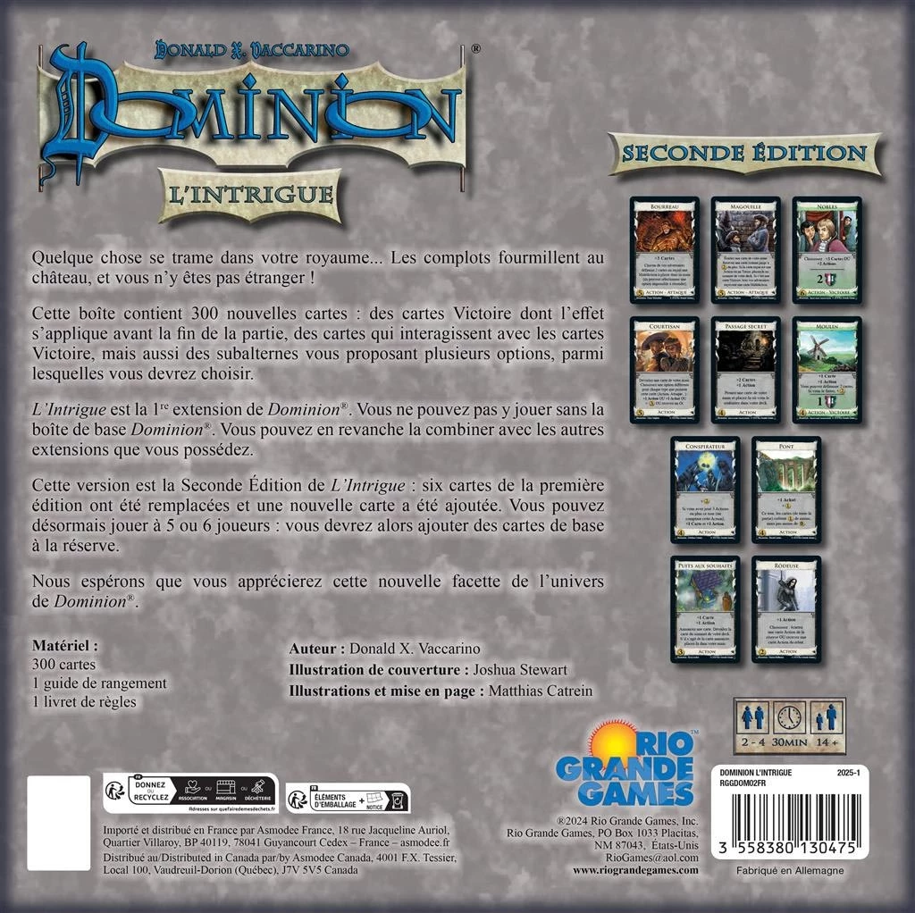 Dominion – L’Intrigue est une extension du jeu de cartes Dominion, où les joueurs se retrouvent à la tête de leur propre royaume, cherchant à l’enrichir en rassemblant des richesses et des provinces. Votre objectif est de construire un Dominion puissant, riche et prestigieux, et pour ce faire, vous devrez rivaliser avec d’autres monarques ambitieux.