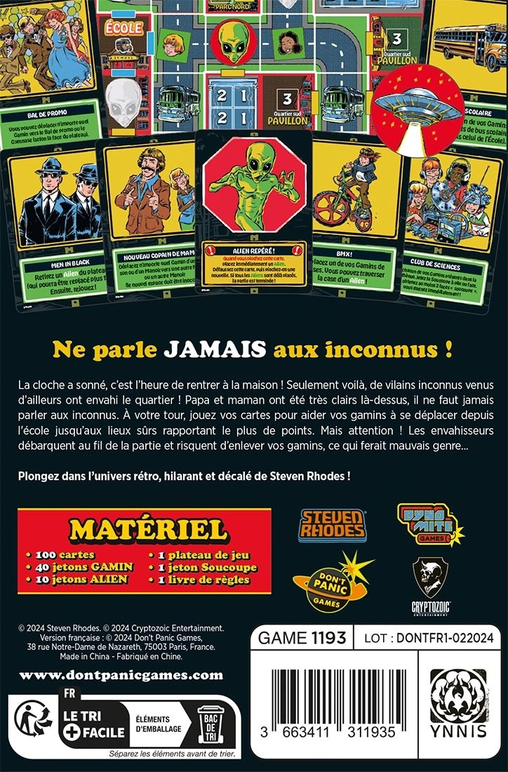 Comment jouer Déplacement stratégique : À chaque tour, jouez vos cartes pour aider vos enfants à avancer. Choisissez judicieusement les chemins pour maximiser vos points tout en restant vigilant face aux inconnus. Inconnus menaçants : Au fil de la partie, des envahisseurs apparaissent sur le plateau, rendant chaque mouvement crucial. Si vos enfants se font attraper, vous risquez de perdre des points, et cela ne fera pas plaisir aux parents ! Un univers rétro et décalé Avec ses illustrations colorées et son ambiance humoristique, Don’t Talk to Strangers offre une expérience de jeu unique qui séduira les amateurs de jeux de société et de nostalgie. Le style visuel de Steven Rhodes ajoute une touche d’humour noir qui ravira les joueurs de tous âges.
