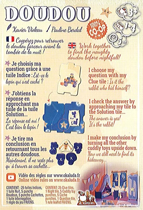 Personne ne connaît la solution au départ : tous les joueurs enquêtent ensemble pour retrouver le bon doudou avant la fin des tentatives. Parents et enfants devront combiner observation, logique et intuition pour résoudre l’énigme… ou compter sur un peu de chance !