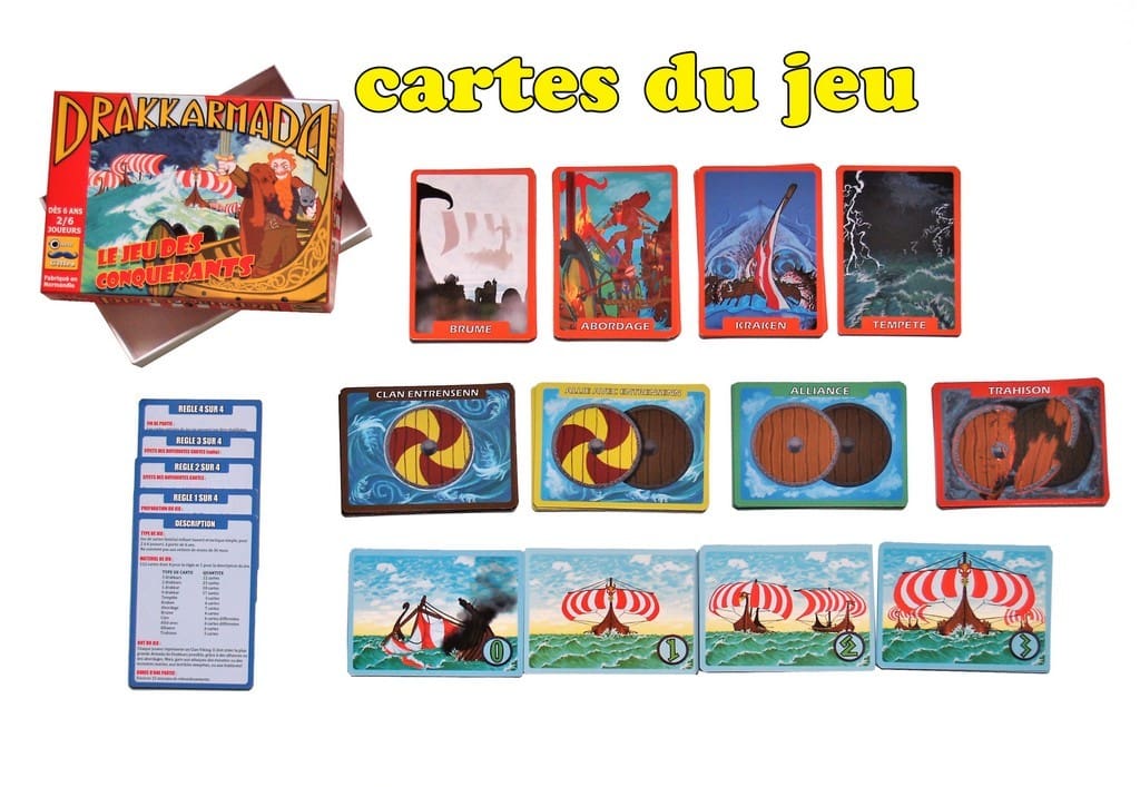 DRAKKARMADA est un jeu de cartes, de tactique simple et de hasard pour 2 à 6 joueurs, petits et grands, à partir de 6 ans. Dans l’univers Viking, à vous de créer la plus importante Armada de Drakkars, malgré l’hostilité d’une nature déchaînée et les rivalités entre clans.