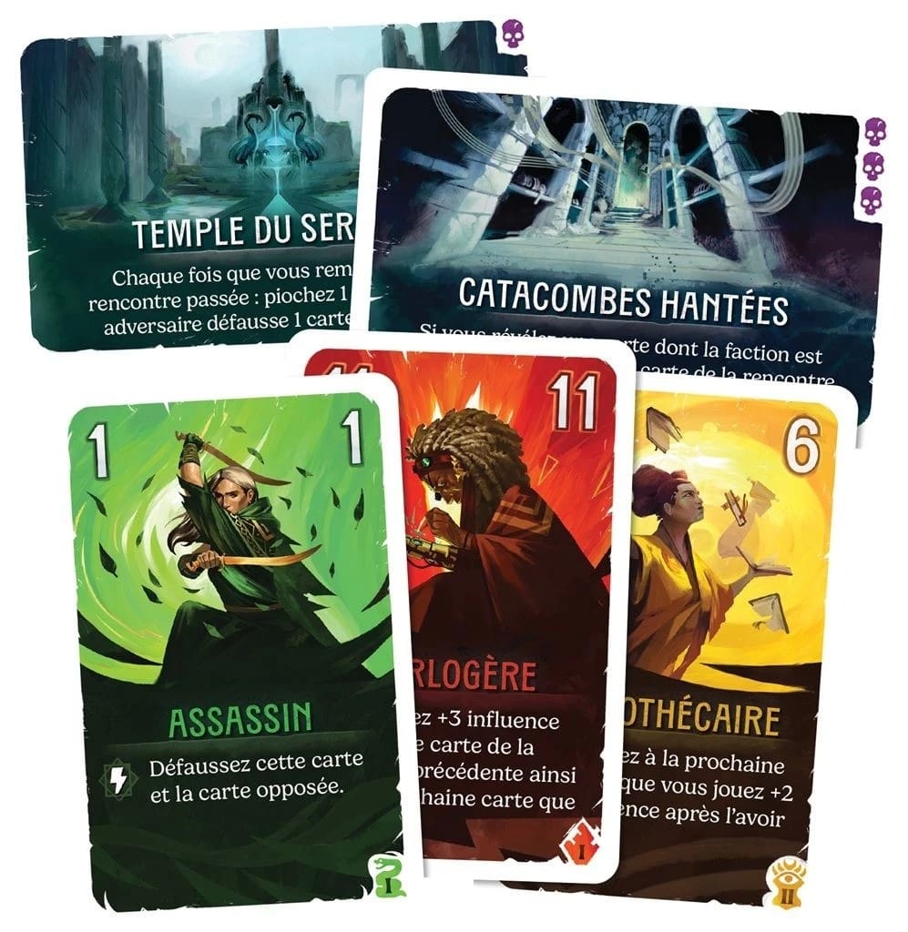 Un jeu de cartes malin, compact, rapide à mettre en place avec de nombreuses possibilités stratégiques qui satisferont les joueurs initiés. En plus, tout a été pensé pour vous offrir une grande rejouabilité. Un second deck de 16 cartes vous permet de découvrir de nouveaux personnages et d’utiliser de nouveaux pouvoirs. Pour corser la difficulté, le jeu contient 8 cartes « Lieux » : dévoilez l’une de ces cartes en début de partie et respecter les conditions spécifiques qu’elle vous impose. Une excellente façon de pousser plus loin la réflexion stratégique et d’ajouter encore plus de suspense à vos parties.
