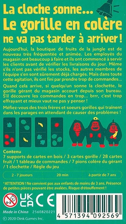 Les joueurs doivent gérer le chaos en tentant de se débarrasser de leurs cartes le plus rapidement possible. Mais attention aux commandes en trop ! Si la cloche sonne, le gorille du gérant vérifie les commandes sur-vendues, et celui qui en a le plus en main risque de perdre la partie.