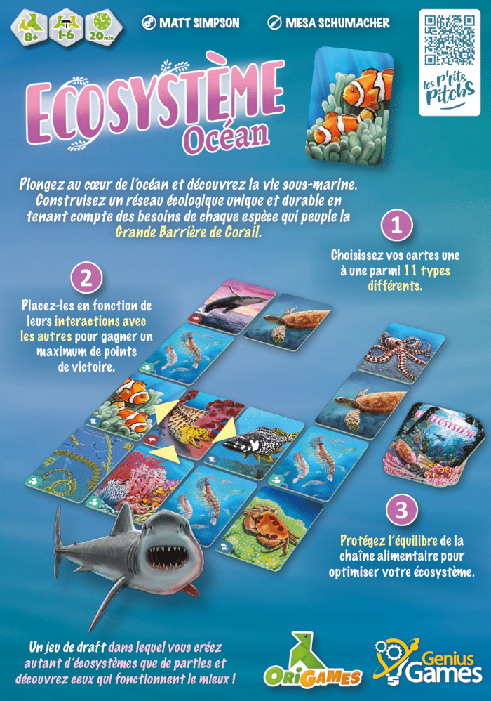 Chaque type de carte que vous choisissez contribue à vos points de victoire, mais c’est l’interaction intelligente entre les cartes qui détermine le gagnant. Respectez la diversité marine, équilibrez la chaîne alimentaire et triomphez en créant l’écosystème le plus robuste et florissant de la Grande Barrière de corail. Plongez dans l’océan de stratégie et de découverte avec « Ecosystème – Océan » !