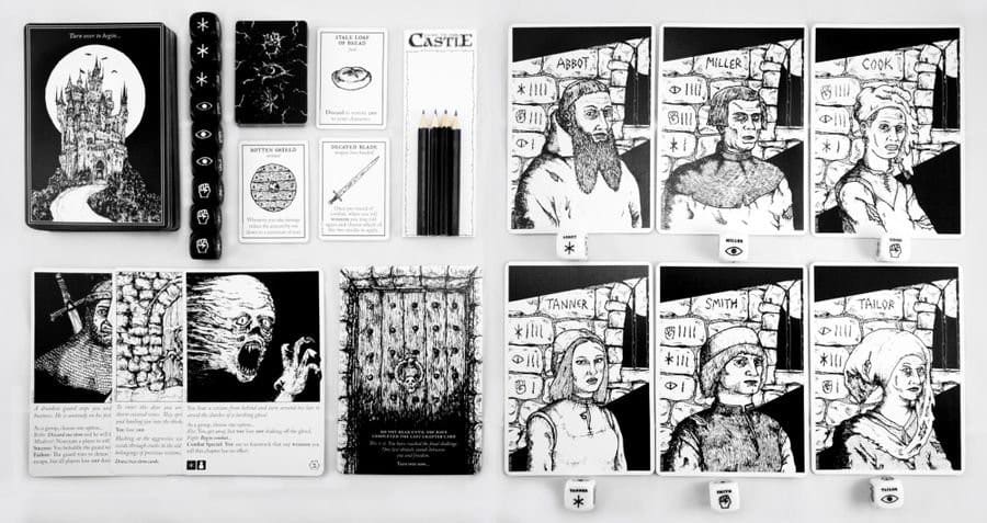 Escape the Dark Castle est un jeu d’aventure simple et fantaisiste qui met l’accent sur l’atmosphère, la narration et la coopération entre les joueurs – parfait pour les nouveaux venus dans le domaine des jeux de société. La mise en place prend 2 minutes et il n’y a jamais deux parties identiques. Les joueurs jouent le rôle de prisonniers qui doivent s’échapper du château et doivent travailler ensemble pour surmonter ses nombreuses horreurs, pièges et défis, chacun étant représenté par une grande carte de chapitre magnifiquement illustrée.