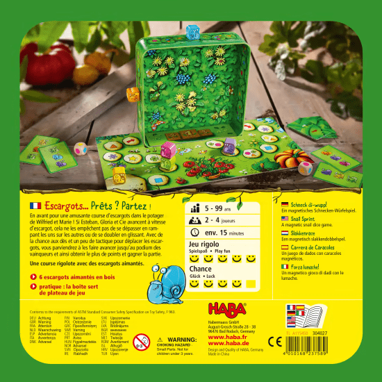Même s’ils se déplacent à vitesse d’escargot, ils peuvent parfois se dépasser en rampant les uns sur les autres ou se doubler en glissant. Avec de la chance aux dés et un peu de tactique pour déplacer les escargots, avancez-les jusqu’au podium des vainqueurs pour obtenir le plus de points et remporter la partie !
