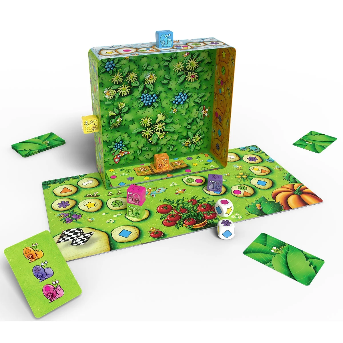 Même s’ils se déplacent à vitesse d’escargot, ils peuvent parfois se dépasser en rampant les uns sur les autres ou se doubler en glissant. Avec de la chance aux dés et un peu de tactique pour déplacer les escargots, avancez-les jusqu’au podium des vainqueurs pour obtenir le plus de points et remporter la partie !