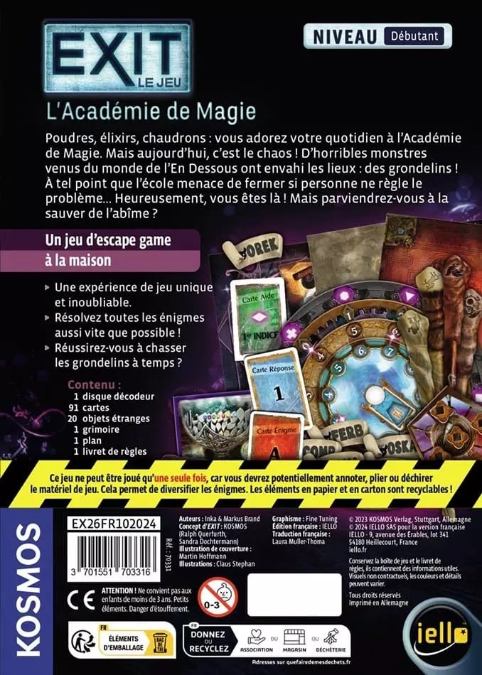 Exit : L’Académie des Magiciens reprend le principe des « escape games » et vous plonge dans un univers où poudres, chaudrons et leçons de magie côtoient de redoutables grondelins. Dans ce scénario, il vous faudra résoudre d’astucieuses énigmes et faire preuve de logique, de coopération et d’observation.