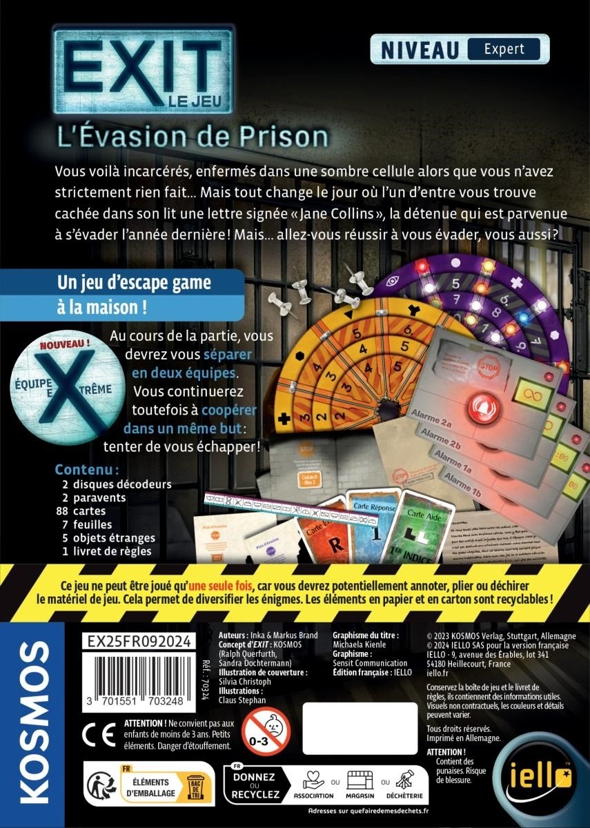 Cela fait des semaines que vous traînez dans cette sinistre cellule… C’est le monde à l’envers ! On vous a arrêtés sans raison, un jour, alors que vous vous rendiez au travail. Vous avez directement atterri ici, à AL-4-AZ, la prison la plus sécurisée du pays. Vous êtes pourtant innocents : vous n’avez commis aucun crime ! Enfin… On peut éventuellement vous reprocher d’avoir créé Hack-Attack, un logiciel que vous avez développé pour prouver à une entreprise du coin que son pare-feu ne servait à rien. Vous vouliez juste les aider, et voilà qu’on vous accuse d’espionnage industriel… Mais tout change lorsqu’un matin, l’un d’entre vous trouve quelque chose entre ses draps : une lettre signée « Jane Collins » ! S’agit-il vraiment de LA Jane Collins, la femme la plus réputée dans le monde des hackers ? Jane a même réussi à « hacker » la prison et à s’évader d’AL-4-AZ l’année dernière. C’est votre idole ! Aurait-elle l’intention de vous aider ? Serait-ce votre chance de quitter cette prison ? Un EXIT « différent » ! EXIT l’évasion de prison est un EXIT niveau Expert, qui vous propose des sensations de jeu inédites. En effet, vous devrez scinder votre groupe en deux équipes et progresser de manière séparée… Êtes vous prêts pour tenter cette impossible évasion ?